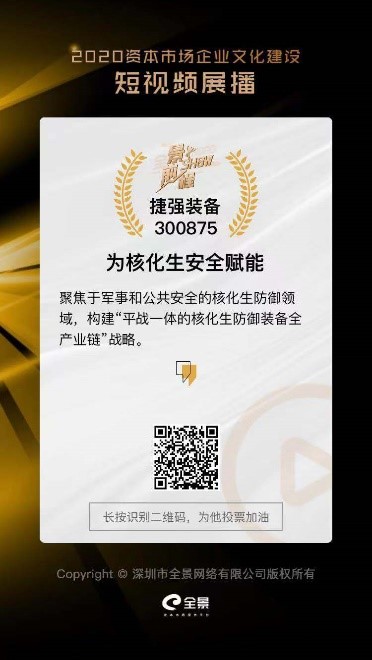 公司宣傳片“捷強(qiáng)裝備:為核化生安全賦能”入選本次“景show前景”展播,為了更好的向社會(huì)各界宣傳捷強(qiáng)文化,展示公司在核化生安全領(lǐng)域的責(zé)任和擔(dān)當(dāng),特邀請您為捷強(qiáng)裝備(股票代碼:300875)投票。